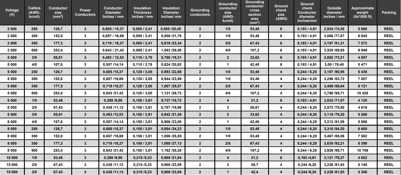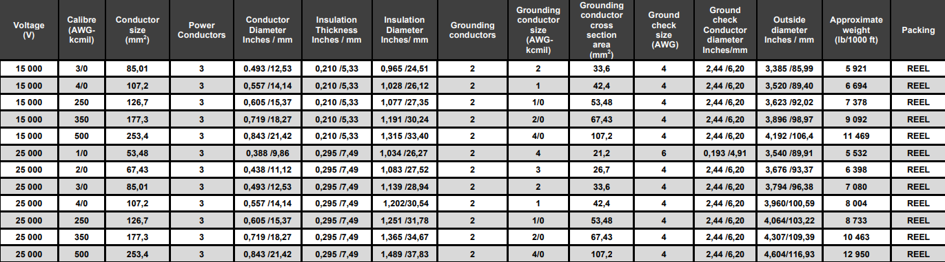 Disponible en 2 kV, 5 kV, 8 kV, 15 kV y 25 kV, adaptándose a las diversas necesidades energéticas de los proyectos mineros chilenos.